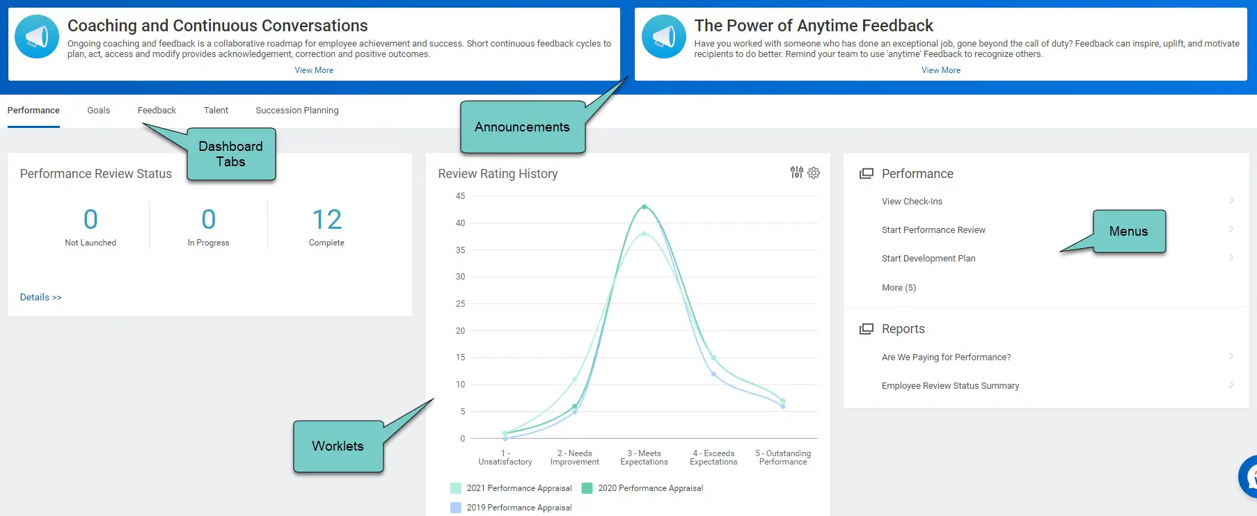 - Create Custom Allowed Worklet tasks such as View Check In, My Team’s Performance Reviews, or Start Development Plan in a Performance Task section